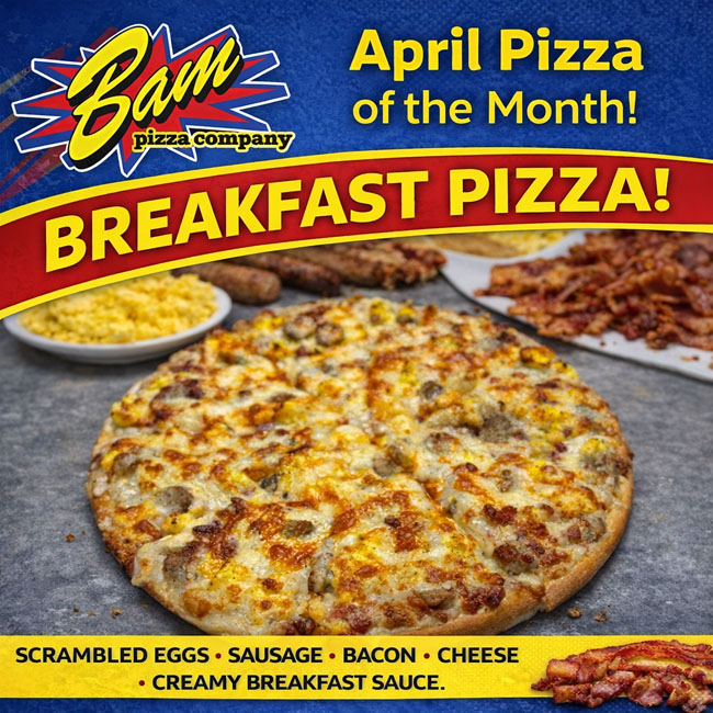 Breakfast for lunch and dinner?!?! Absolutely!! Try our pizza of the month, the breakfast pizza.